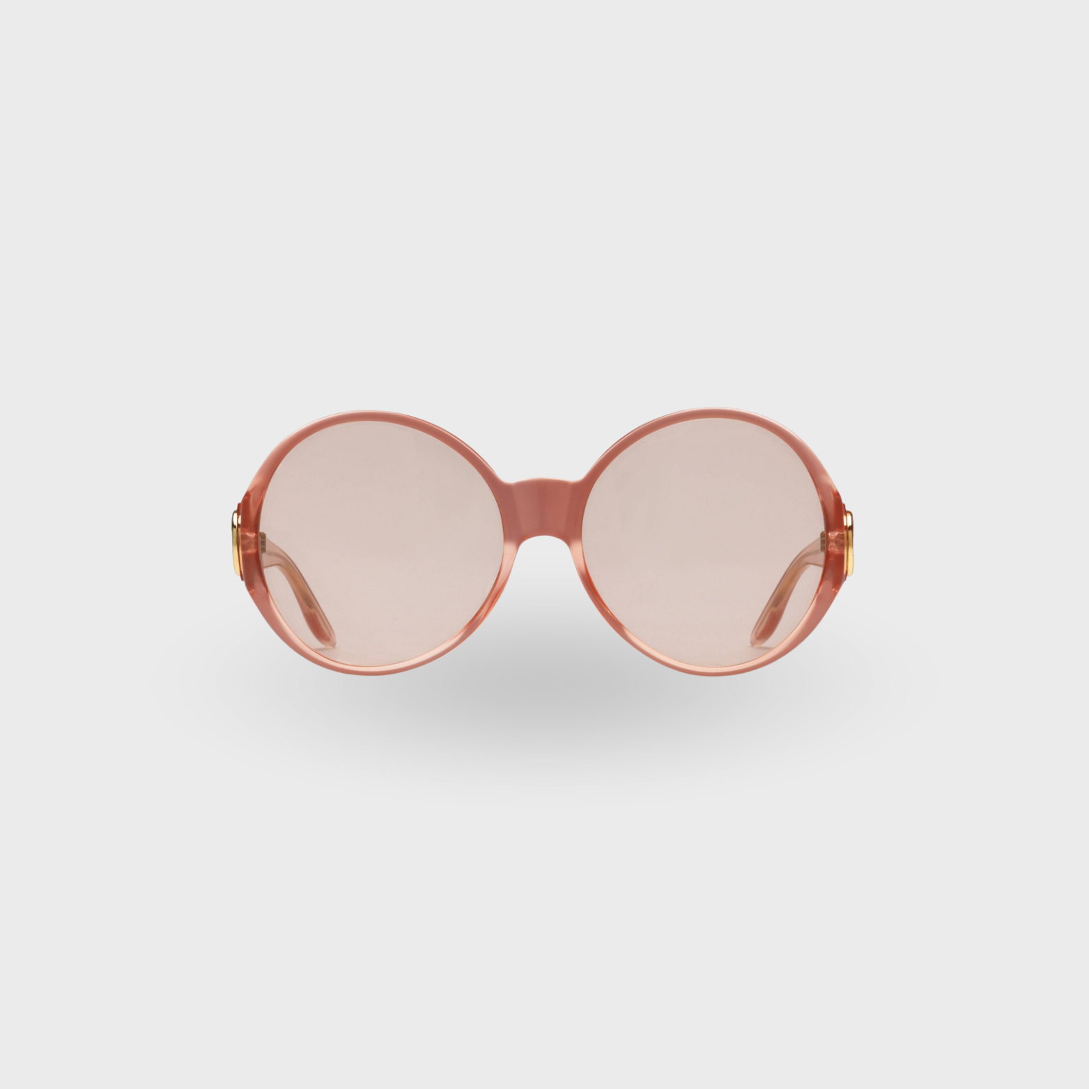 Un diseño ovalado y contemporáneo que aporta un aire femenino y delicado. La montura en acetato rosa durazno translúcido se combina con lentes en rosado sólido, creando un look moderno, juvenil y sofisticado.