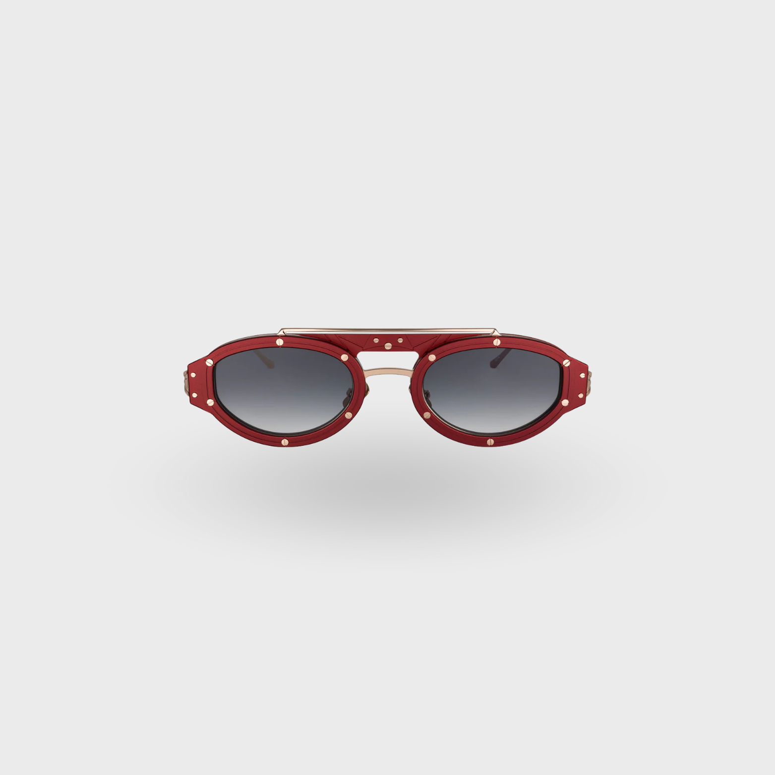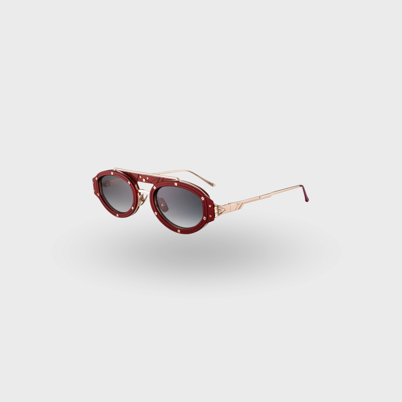 El modelo VT‑2 de Vysen Eyewear, llamado The Vita, es una expresión de lujo contemporáneo. Su diseño redondo panto combina un marco de titanio dorado brillante y mate, creando un contraste monocromático cálido y sofisticado. Las lentes en negro sólido aportan sobriedad y protección total contra los rayos UV. Los detalles como los tornillos de acero inoxidable y el acento rojo característico en la varilla izquierda refuerzan la estética industrial y futurista de la marca.